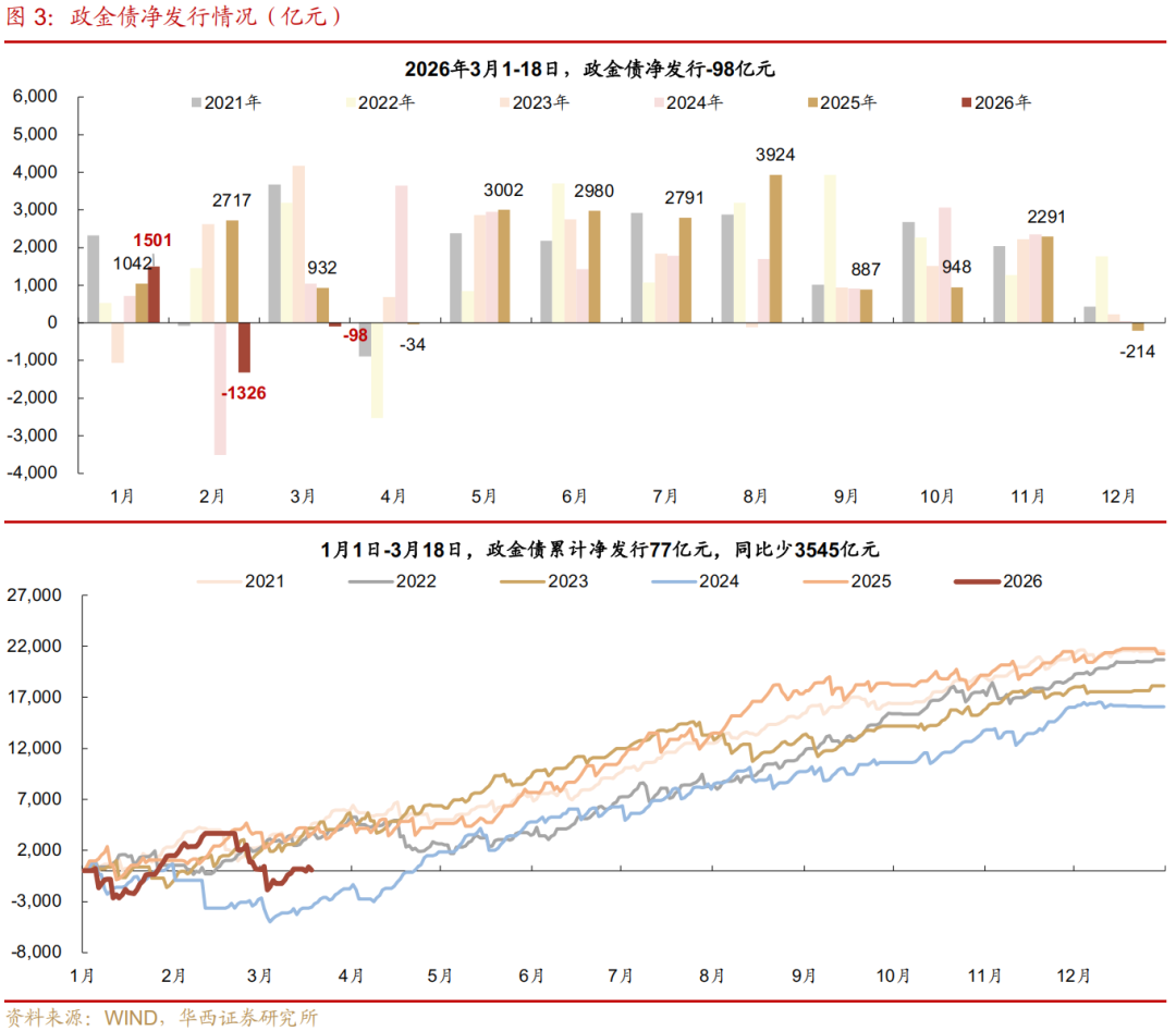 短端表现较强的背后,是持续稳定的资金面。3月税期走款首日,央行逆回购净投放不增反减,规模由昨日的888亿元降至115亿元,不过资金价格毫无波澜,R001、R007双双持稳于1.40%、1.50%,这一结果或反映当前资金面已处于自发平衡状态,对央行呵护的依赖度相对较弱,平稳跨季或可期。